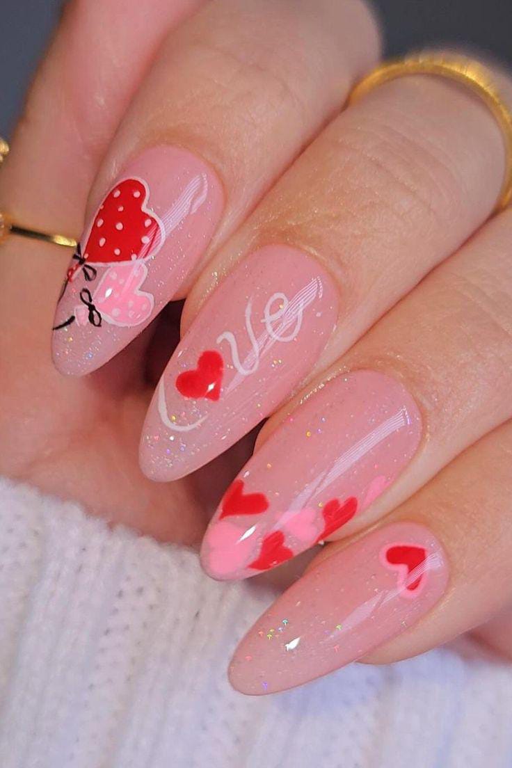 Sheer pink almond nails showcase scattered red hearts, soft glitter, and playful love-inspired details. The design feels fun, simple, and full of Valentine charm.