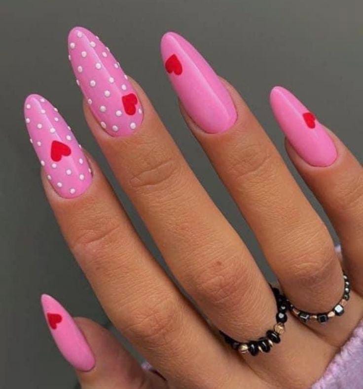 Soft pink nails with white dots and small red hearts feel playful and cute. The overall style is fun, light, and simple perfect for Valentine’s Day.