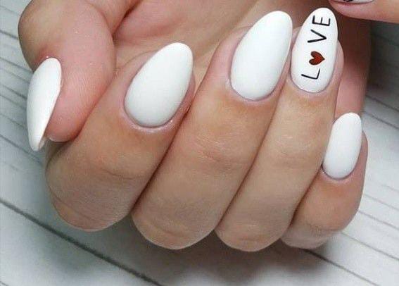 Matte white nails create a clean and timeless style. The simple love text and tiny heart make it perfect for minimal Valentine vibes.