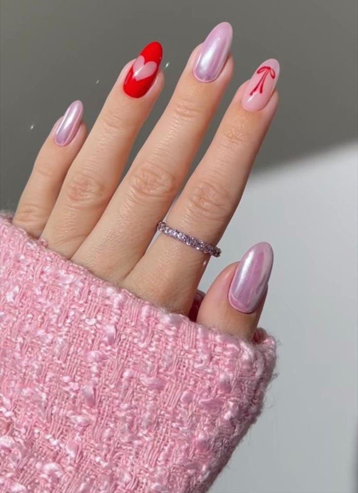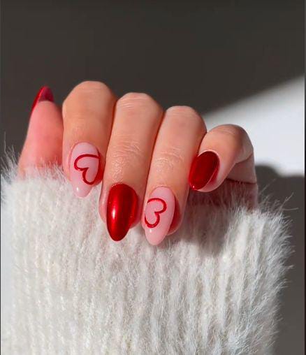 Red chrome nails are mixed with pale pink accent nails featuring outlined heart designs. The contrast creates a charming, minimal Valentine’s look.