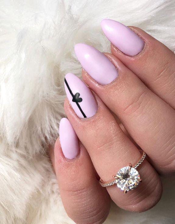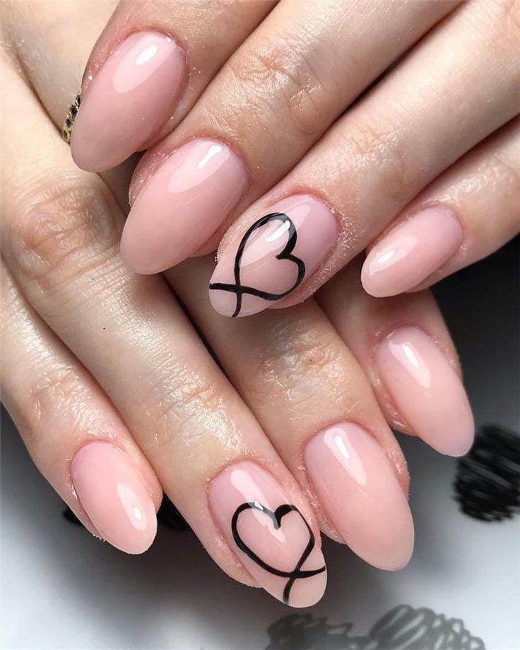 Muted blush almond nails give a clean and modern feel. A thin black line with a tiny heart adds subtle, simple Valentine charm.