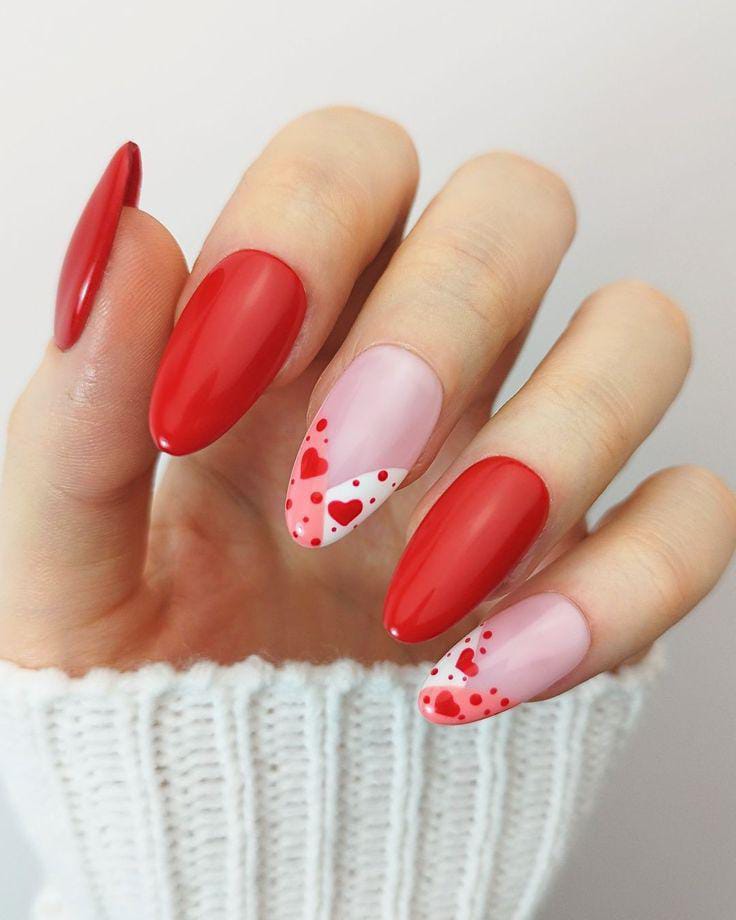 Bold red nails contrast beautifully with soft pink tip bases. Scattered heart patterns bring a playful yet polished, simple and full of Valentine style.