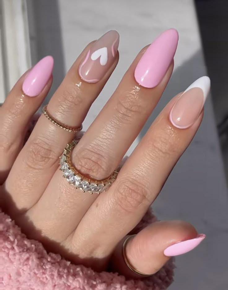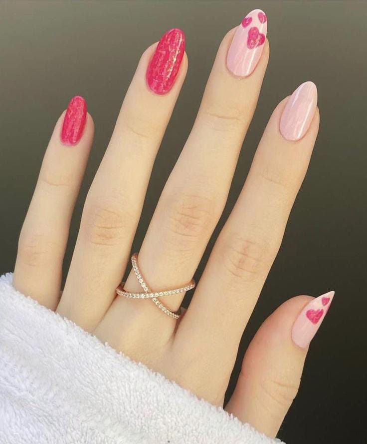 This style combines nude pink nails with bright pink accent nails for contrast. The scattered heart details keep the design fun yet simple Valentines.