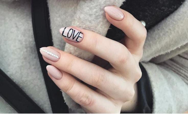 Neutral nude almond nails look chic and understated. A simple “LOVE” accent nail adds a romantic Valentine message without being loud.