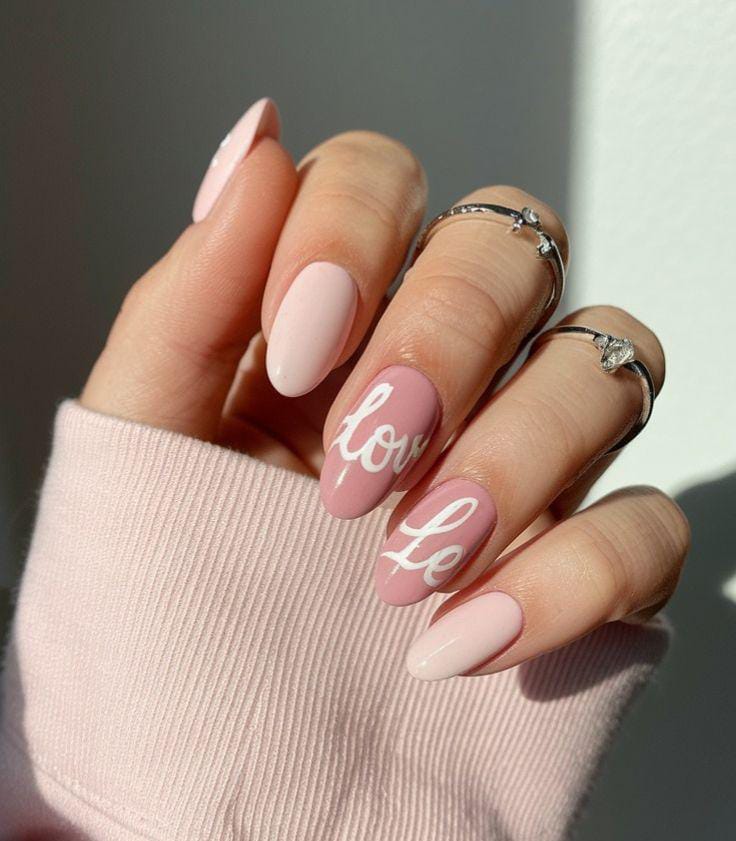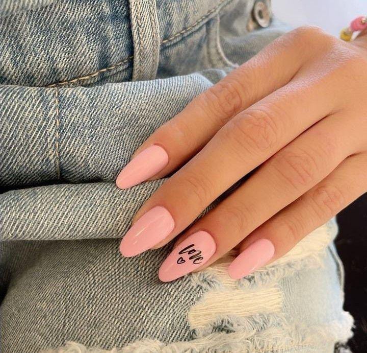 Soft blush pink almond nails give a clean, romantic look, with a simple handwritten “love” accent. The overall vibe is minimal, sweet, and effortlessly Valentine-ready.