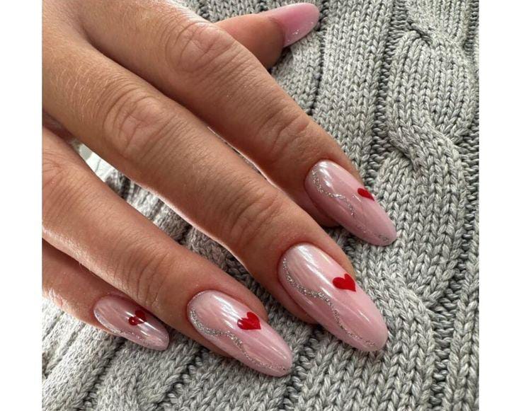 Sheer pink almond nails feature small red hearts and a soft shimmer swirl detail. The look is elegant, cozy, and simple for Valentine’s Day.
