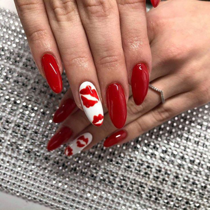 Glossy deep red almond nails are paired with a white accent nail featuring soft red lips shapes. The look is simple, elegant, and perfect for a timeless Valentine vibe.