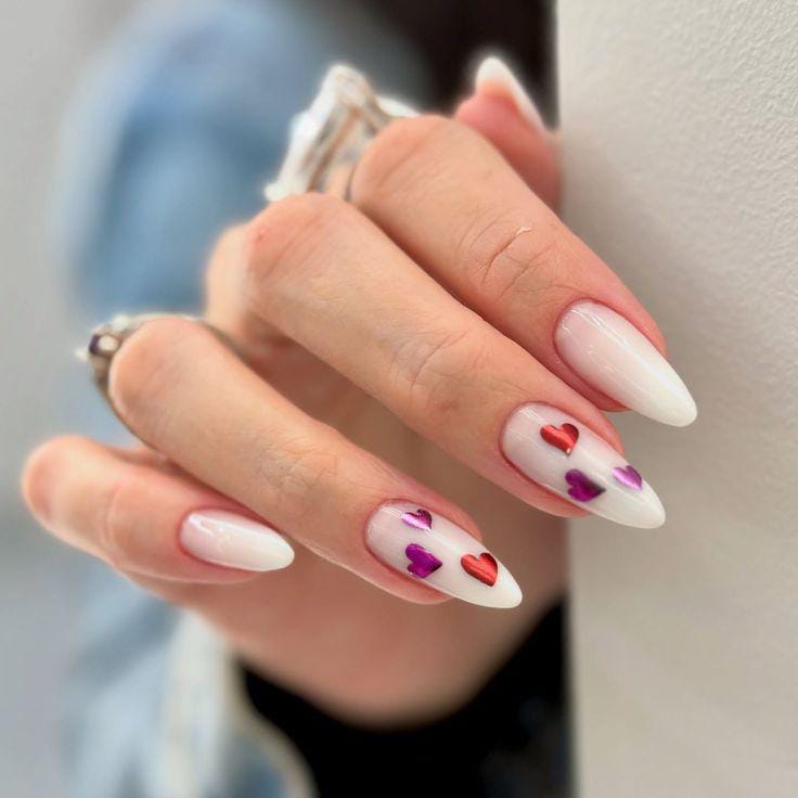 Soft white almond nails are decorated with tiny red and purple metallic hearts scattered lightly across the surface. The overall style feels playful, simple, and very romantic Valentine.