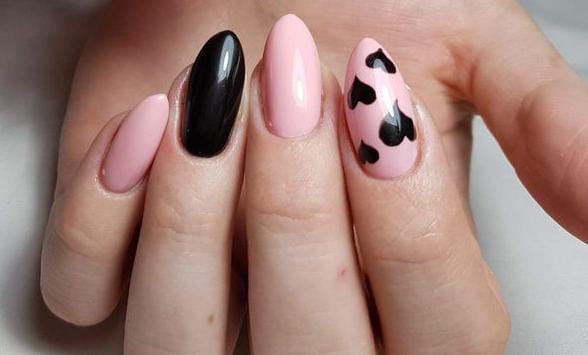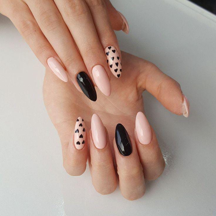 Soft blush pink almond nails are paired with glossy black accents and tiny heart details. The look feels romantic with a modern, simple Valentine’s contrast.