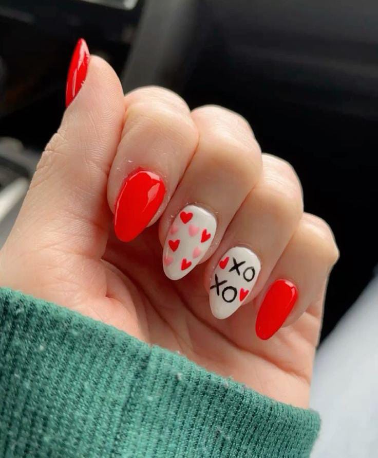 Bright red almond nails mix with white accent nails featuring hearts and playful “XO” lettering. This design feels fun, flirty, and perfect for simple Valentine’s Day.