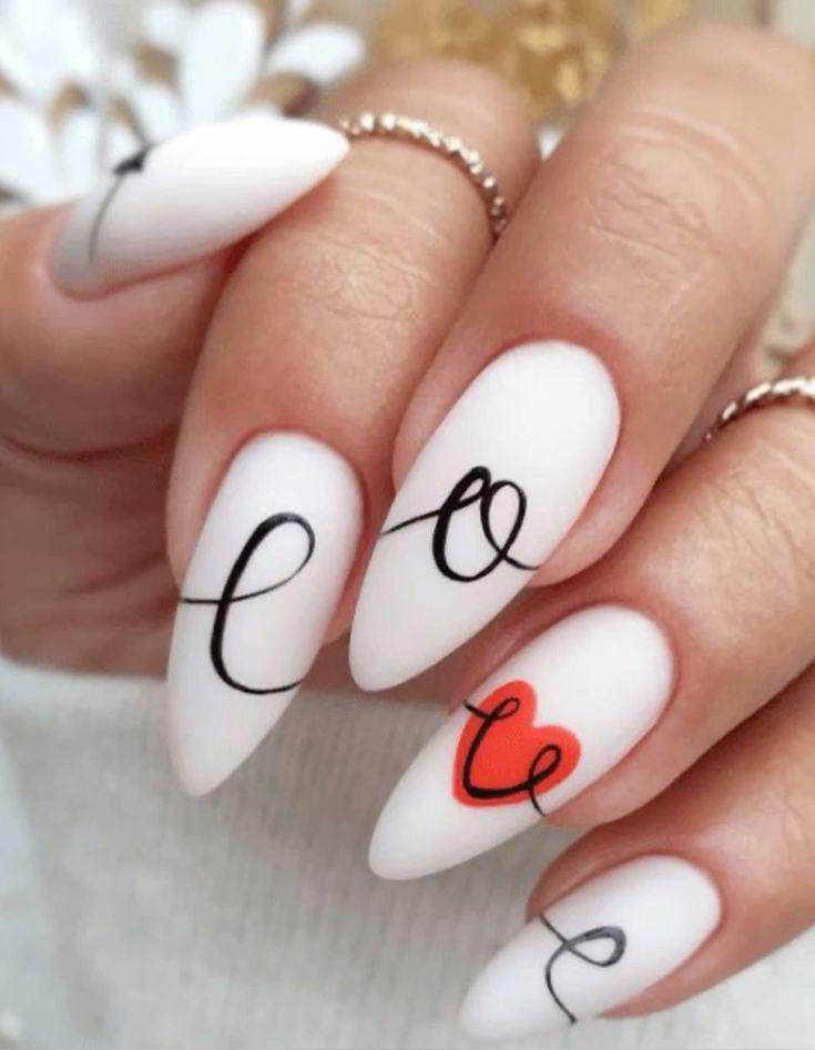 Clean white almond nails are decorated with thin black script lines and a small red heart. The style is minimal, classy, and very chic Valentines.