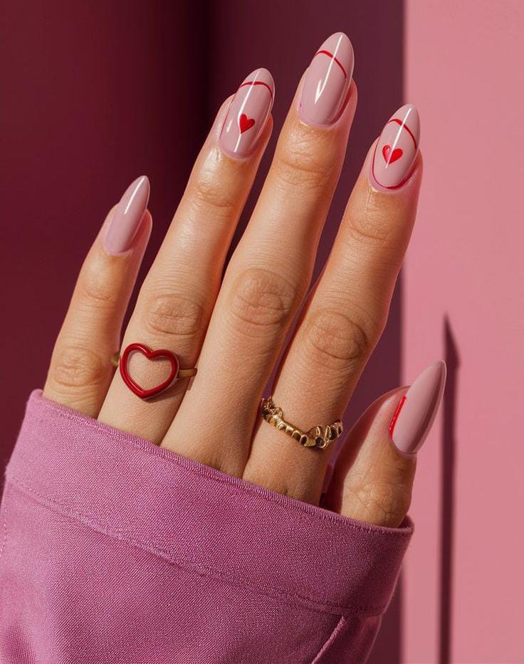 Light pink and red almond nails are paired with thin red lines and tiny heart details. The design feels feminine, simple, and delicately romantic Valentine.