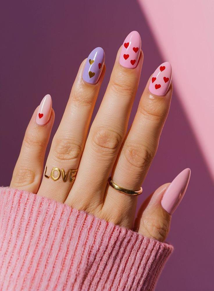 Light pink and pastel shades are decorated with tiny heart patterns across the nails. This look feels playful, soft, and very simple Valentine-inspired.