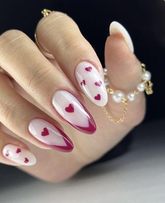 A sheer milky base is paired with tiny red hearts and soft pink tips. The design feels elegant, delicate, and perfect for a minimal Valentine’s look.