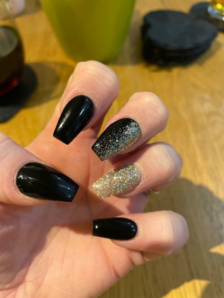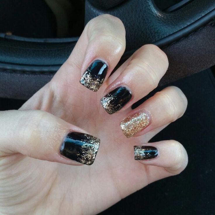 This look features glossy black nails topped with a smooth gold-glitter gradient for a bold yet festive Christmas vibe. The mix of solid black and fully glittered accents adds a touch of glam without feeling overdone.