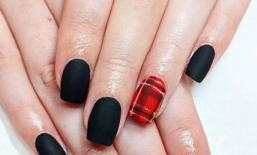 Matte black nails are elevated with a single bold red plaid accent, creating a cozy and festive Christmas feel. The simple color palette keeps the look clean while the plaid nail adds the perfect holiday statement.