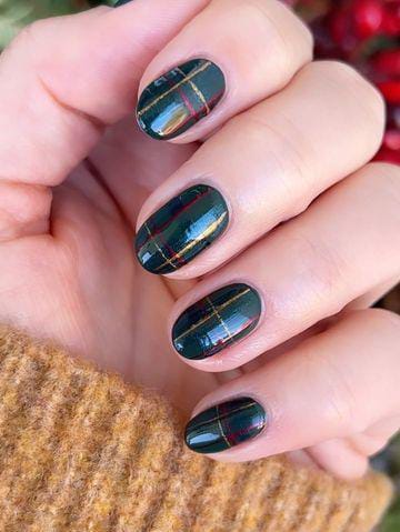 This design features deep, dark nails decorated with fine red and gold plaid lines, giving a cozy, festive, winter- Christmas season vibe without being too bold.