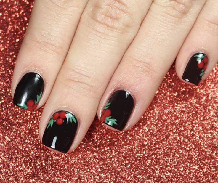 Simple black nails are dressed up with small red berries and green leaves near the cuticles and tips, adding a subtle and classic Christmas accent.