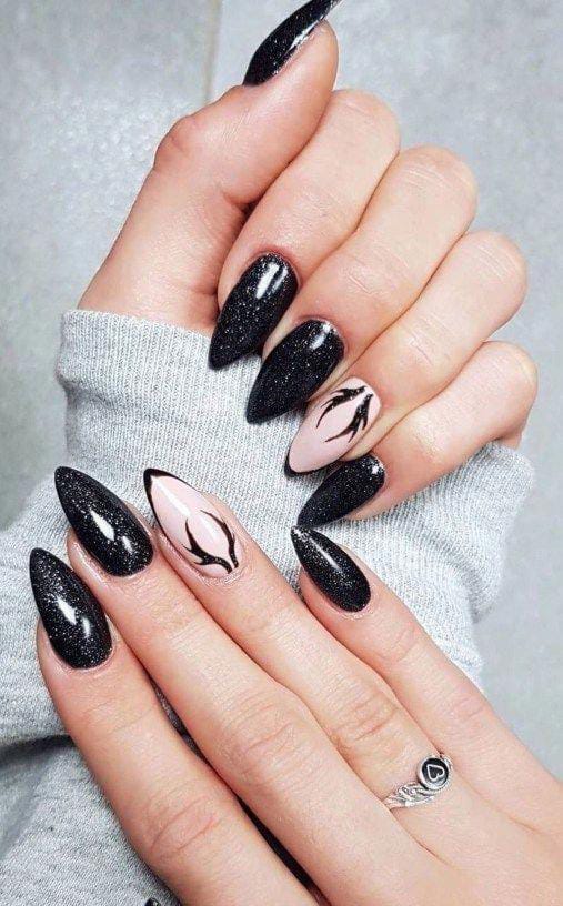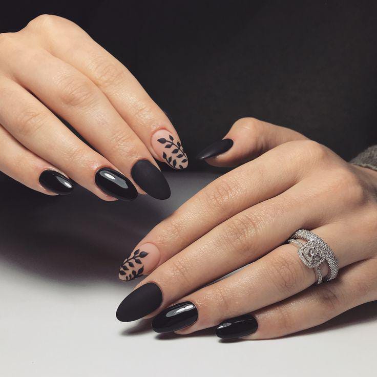 Matte and glossy black nails pair with nude nails featuring delicate black leaf patterns, creating a chic, minimal, winter- Christmasinspired style.