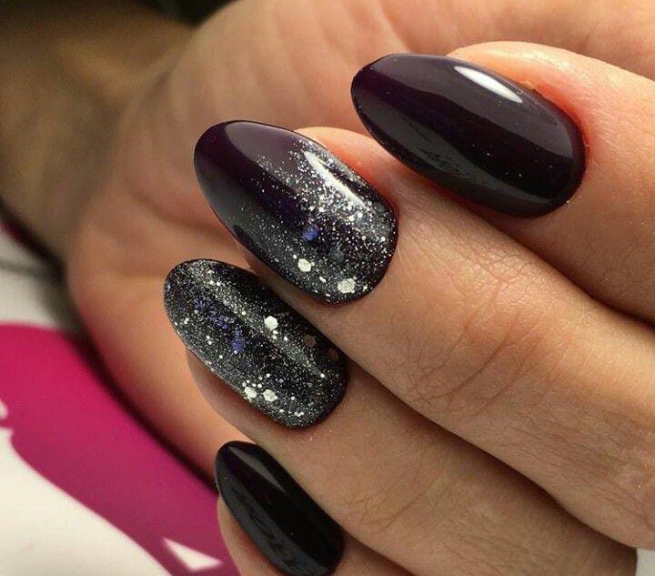 Deep black- Christmas nails blend into a shimmering silver galaxy effect, creating a soft cosmic sparkle. The scattered glitter makes the design feel dreamy and wintry.