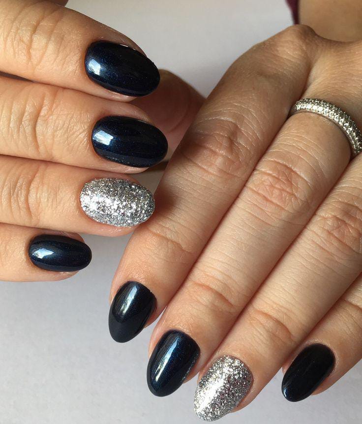 These sleek dark black nails are paired with bright silver glitter accent nails for a clean, elegant contrast. The mix of shine and sparkle gives it a classy Christmas holiday feel.