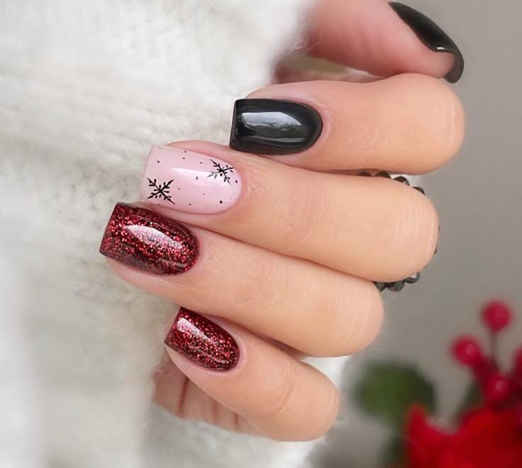Glossy black nails are paired with deep red glitter and a soft pink snowflake-accent nail, creating a warm and cozy Christmas mix. The combination feels festive but still simple and wearable.