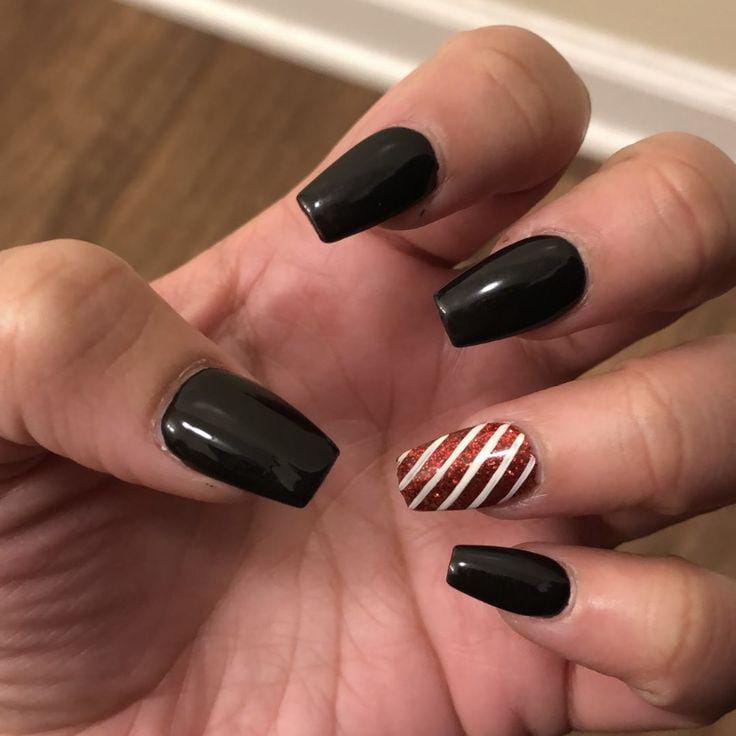 Mostly glossy black nails get a fun Christmas twist with one red-glitter accent nail striped in crisp white, creating a subtle candy-cane effect without overpowering the set. Clean, bold, and festive.