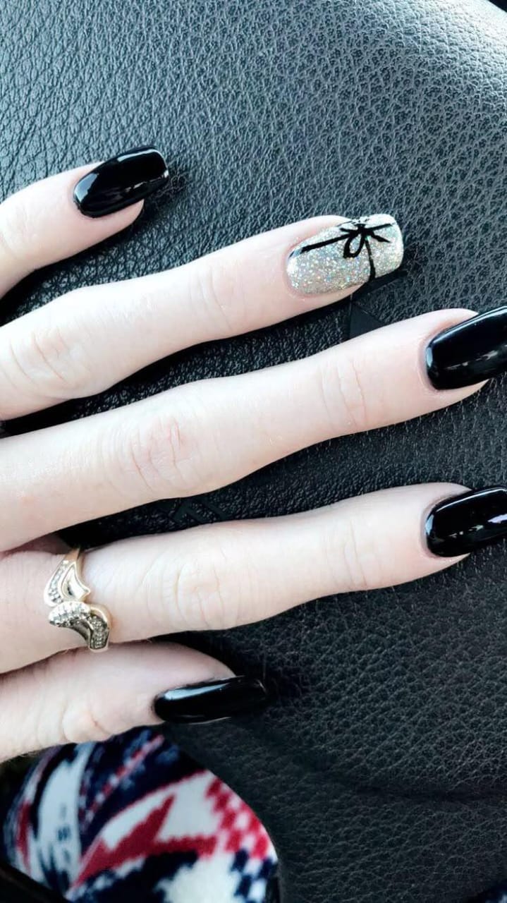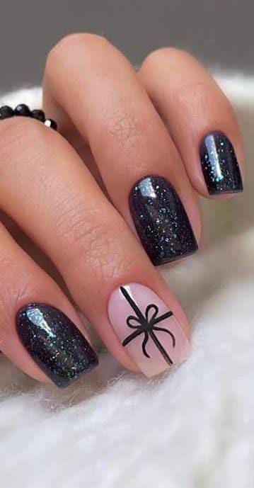 Dark, glittery black nails are paired with a soft nude accent nail featuring a simple black ribbon bow. The mix of sparkle and subtle detailing creates a chic Christmas holiday-inspired contrast.