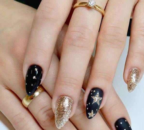 Black glitter-fade nails blend beautifully with gold textured accents and star motifs, giving the whole look a glamorous, Christmas holiday-party shimmer.