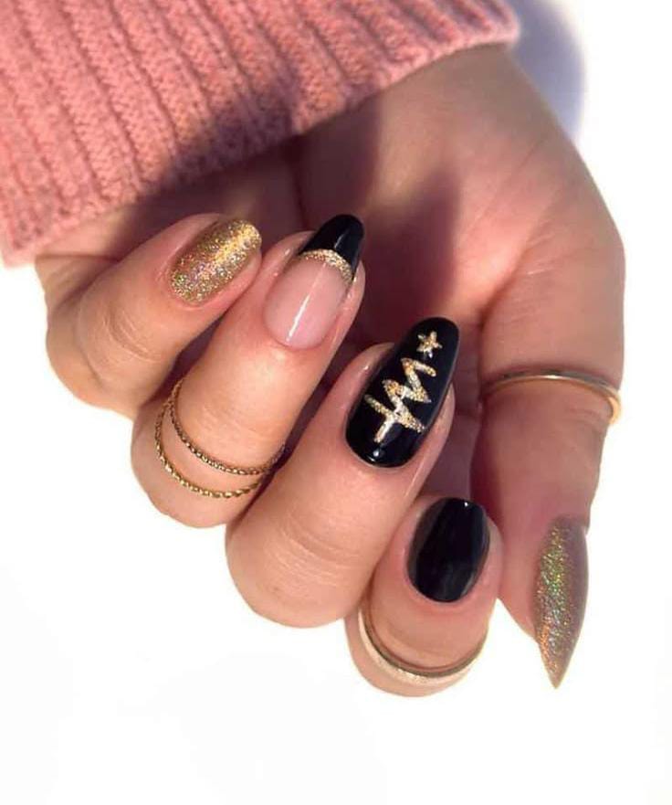 A combination of black nails with gold star details and full gold glitter nails creates a glamorous, festive look. The contrast makes the design feel rich, warm, and perfect for Christmas holiday celebrations.