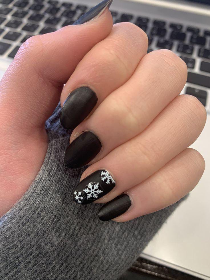 Matte black nails get a winter upgrade with crisp white snowflake art, giving the look a cozy, snowy- Christmas holiday night feel.
