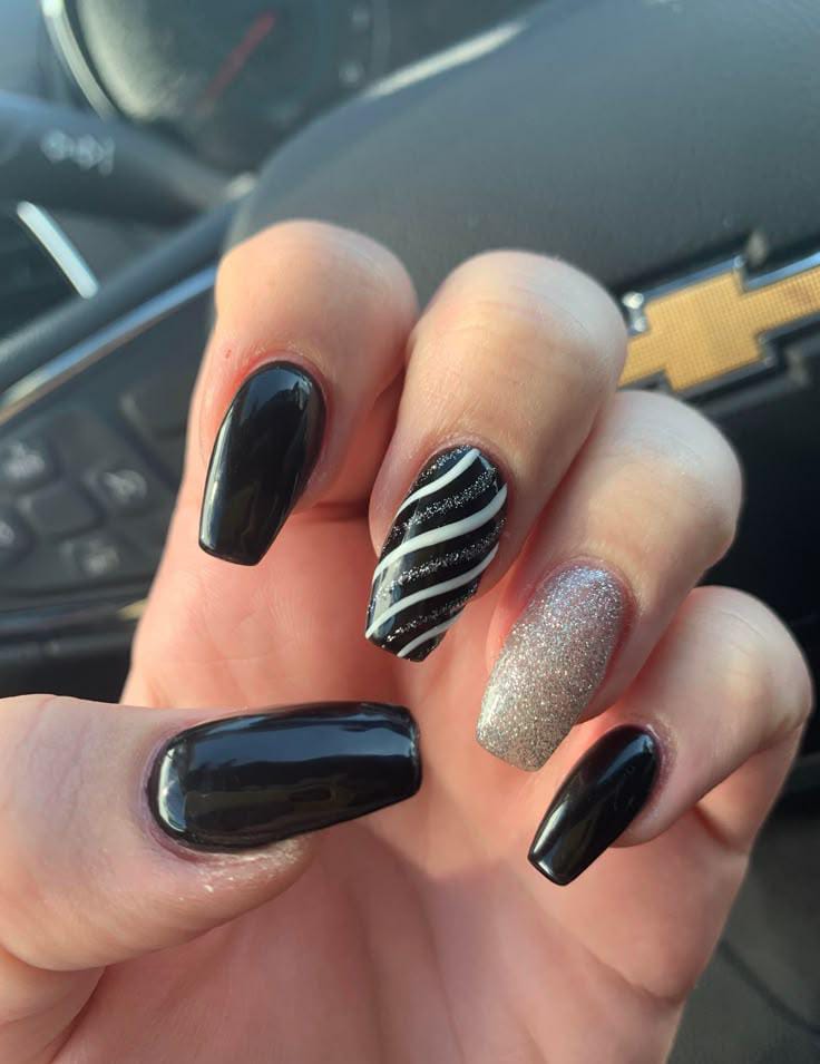 Glossy black nails are paired with silver glitter and a striped accent nail featuring black, white, and sparkle for a cool, wintry feel. It mixes sleek shine with soft shimmer, keeping the Christmas holiday look stylish and modern.