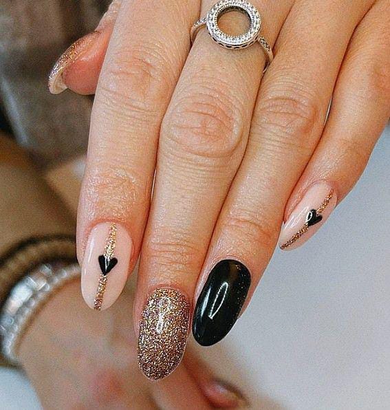 A soft nude base mixed with gold glitter and bold black accents creates a romantic yet glamorous Christmas holiday look, finished with tiny heart details.