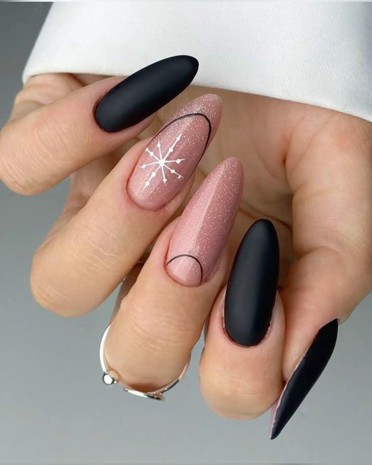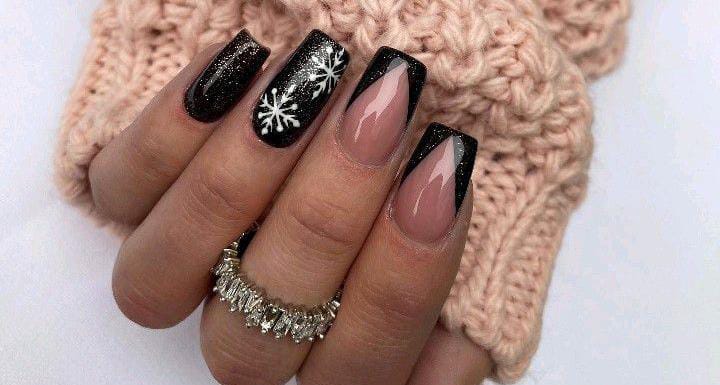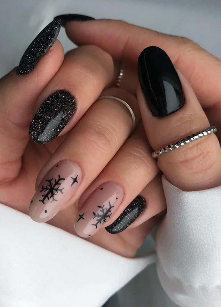 A blend of glossy black and black-glitter nails is softened with nude accent nails decorated with delicate black snowflakes. The mix of dark tones and airy designs creates a cozy winter-night Christmas vibe.