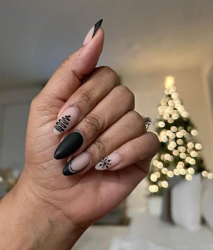 Matte black and nude nails blend together with simple black line art—like a tiny Christmas tree swirl and a minimalist snowflake. It’s understated, stylish, and perfect for anyone who loves a clean holiday aesthetic.