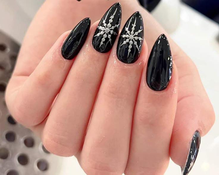 Glossy black and crisp white nails are accented with delicate snowflake patterns, creating a striking winter contrast. The mix of dark polish and clean line art gives it a cozy yet elegant Christmas feel.