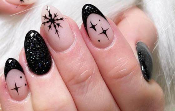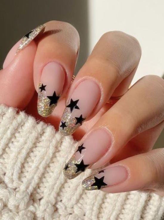 A mix of glossy black and soft nude nails with glitter accents creates a celestial vibe, highlighted by star-like designs that feel Christmas festive and elegant.