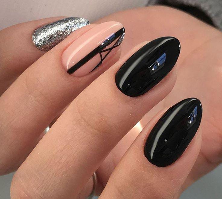 A mix of glossy black and soft nude tones is finished with shimmering silver, creating a frosty edge effect on the accent nails. The combination feels delicate yet bold, ideal for a refined Christmas holiday look.