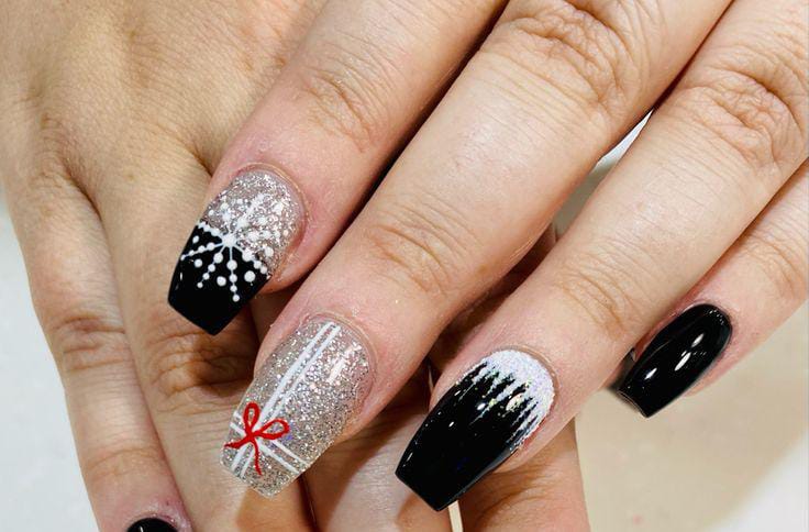 A mix of black polish and shimmering silver glitter is paired with holiday touches like white snowflake dots, a tiny red bow, and a frosty tree-line effect. The contrast of sparkle and black creates a chic yet playful Christmas design.
