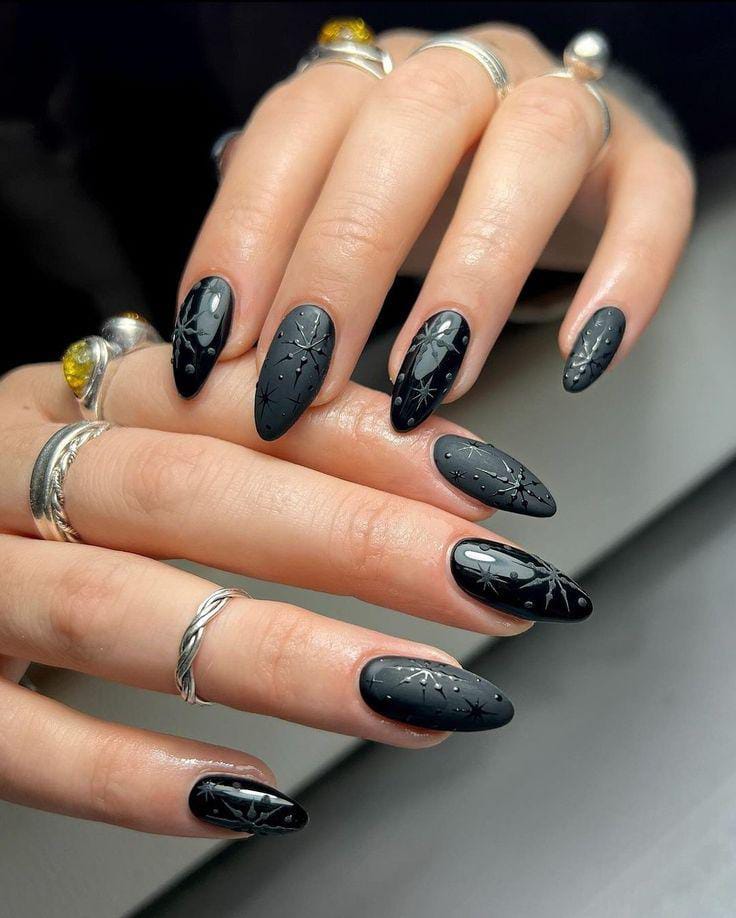 Matte black nails are paired with subtle glossy snowflakes and dots, creating a sleek, moody celestial look. It’s bold but understated, perfect for a modern Christmas style.