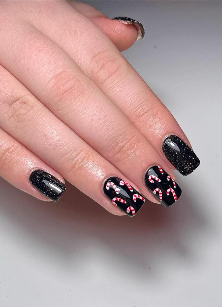 Black glossy and glitter nails sit alongside bright red-and-white candy cane patterns, giving a fun pop of color against the dark base. The contrast feels cheerful and classic Christmas, while still keeping the overall look sleek.