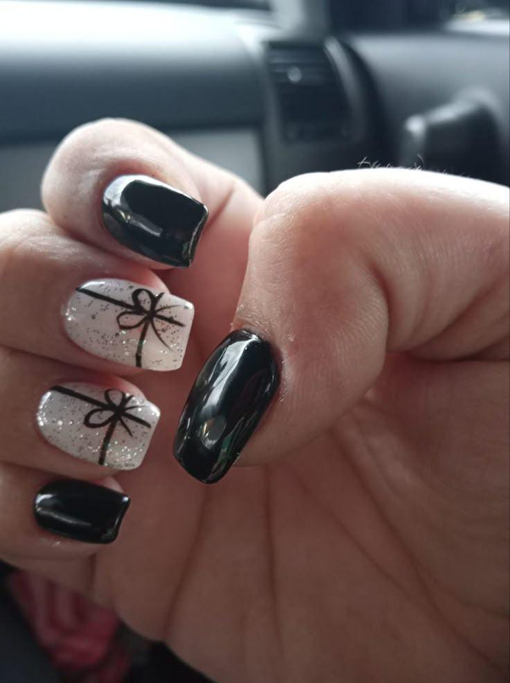 Glossy black nails are balanced by white, glittery accent nails featuring delicate gift-bow designs. This look blends cute Christmas charm with a clean, polished finish.