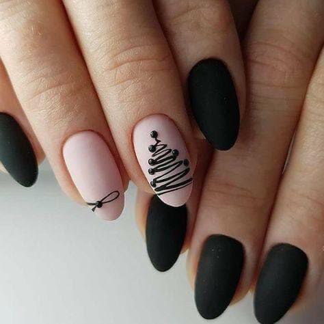 Matte black nails are softened with blush-pink accent nails, one featuring a simple black Christmas tree squiggle for a cute holiday touch. It’s a minimal and modern Christmas design with a cozy, soft vibe.