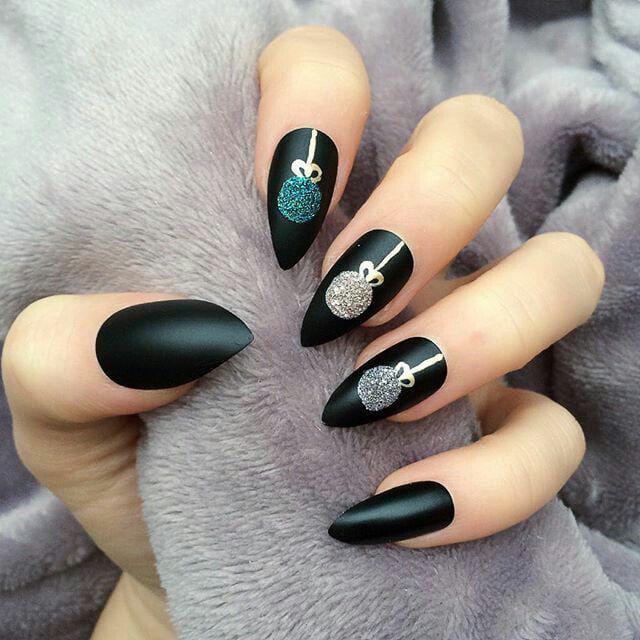 This design features sleek matte black stiletto nails decorated with small glittery ornament accents, giving a chic yet festive Christmas feel. The contrast between the soft matte finish and the sparkly baubles adds a stylish holiday touch.