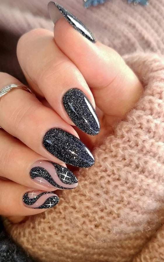 These glossy black glitter nails create a cosmic, shimmering effect, paired with wavy accent designs on nude bases for a modern and Christmas festive twist. The overall look feels elegant, sparkly, and winter-night inspired.