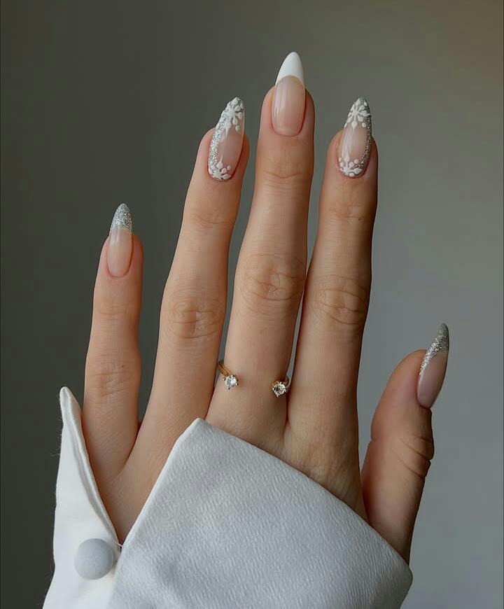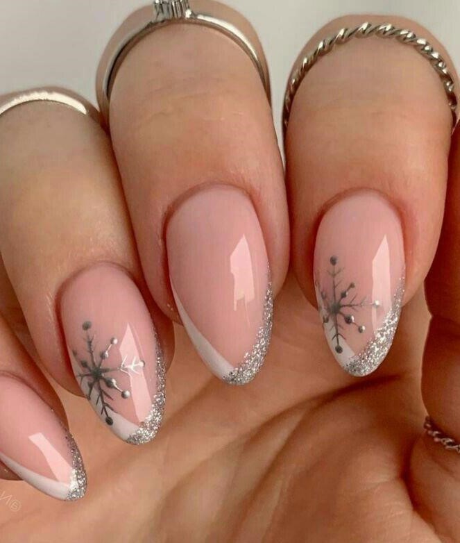 A nude base pairs beautifully with soft white French tips, finished with fine silver glitter edges and minimal snowflake accents. It’s simple, polished, and festive without being too bold.
