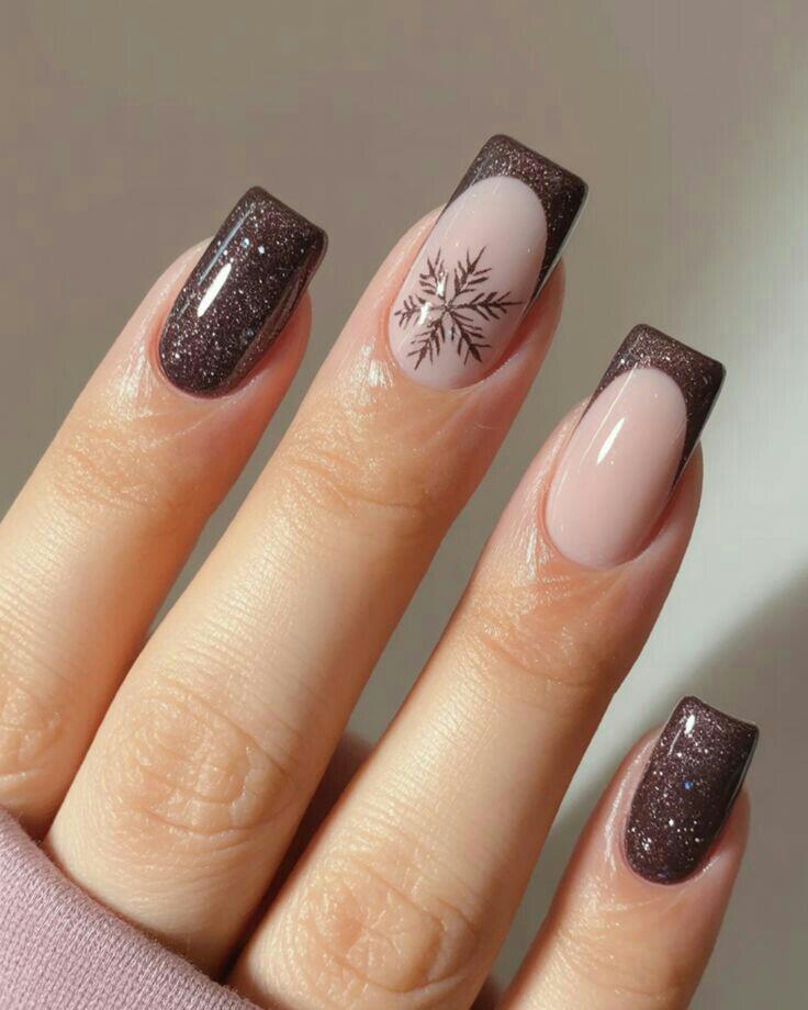 Deep chocolate-brown glitter tips paired with a soft nude base create a cozy winter vibe. The single snowflake accent keeps the look seasonal and elegant without feeling too busy.