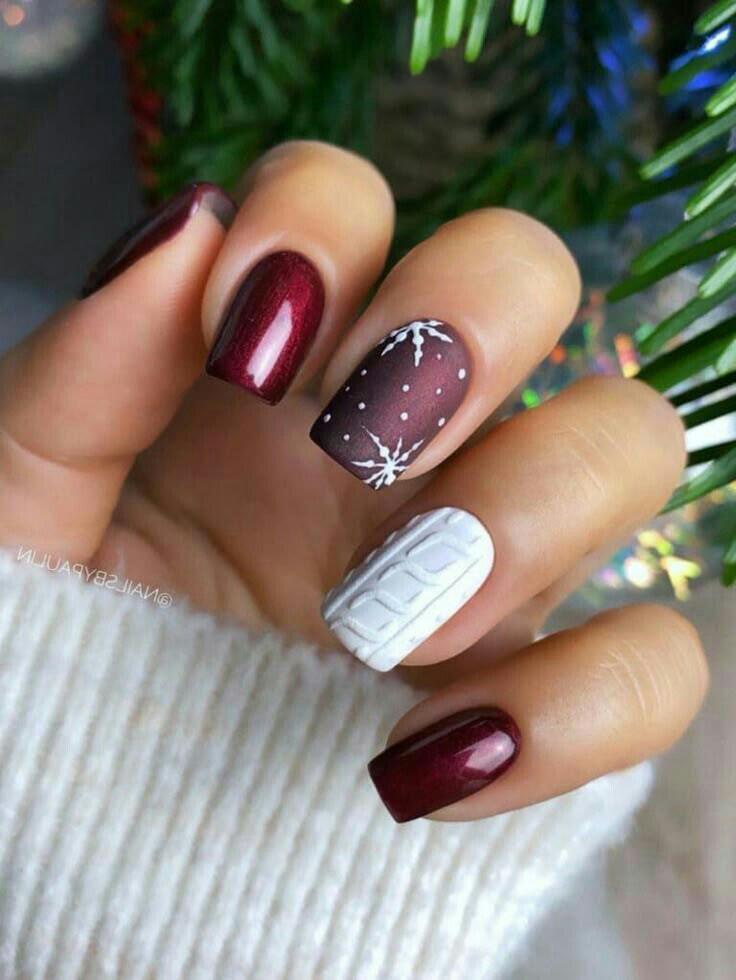 This design blends deep, glossy burgundy nails with a soft matte accent featuring delicate white snowflake art. The white knit-texture nail adds a cozy winter touch, making the whole set feel festive yet classy.