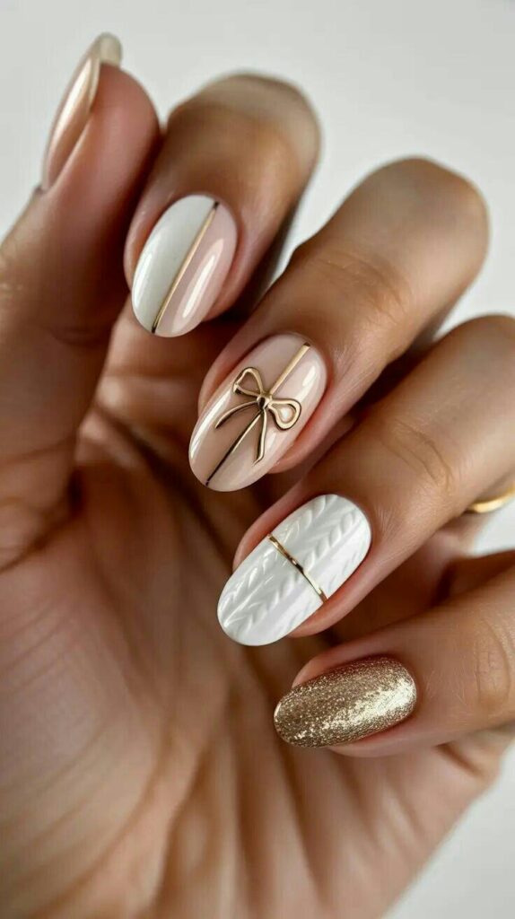 A mix of creamy neutrals and soft white tones is elevated with thin gold striping and a dainty gold bow accent. The knitted white nail brings subtle winter charm while the gold-glitter nail adds a polished holiday sparkle.