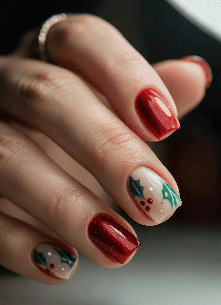 Rich, shimmering red nails are paired with soft nude accents decorated with holly leaves and berries. The design feels cheerful and seasonal, but still elegant enough for a simple winter look.